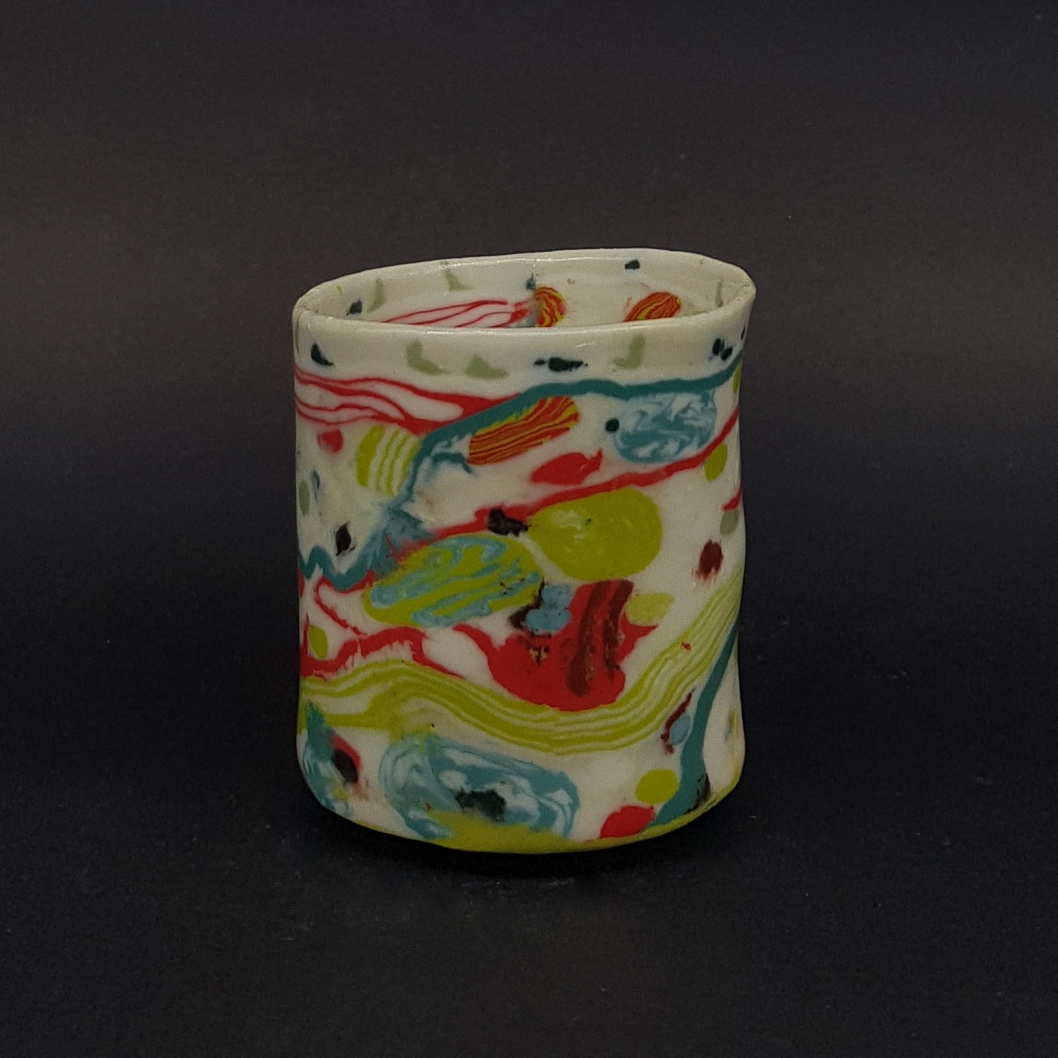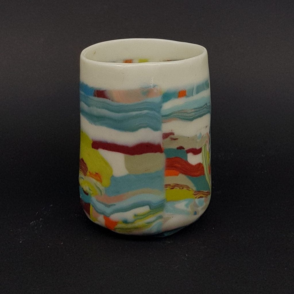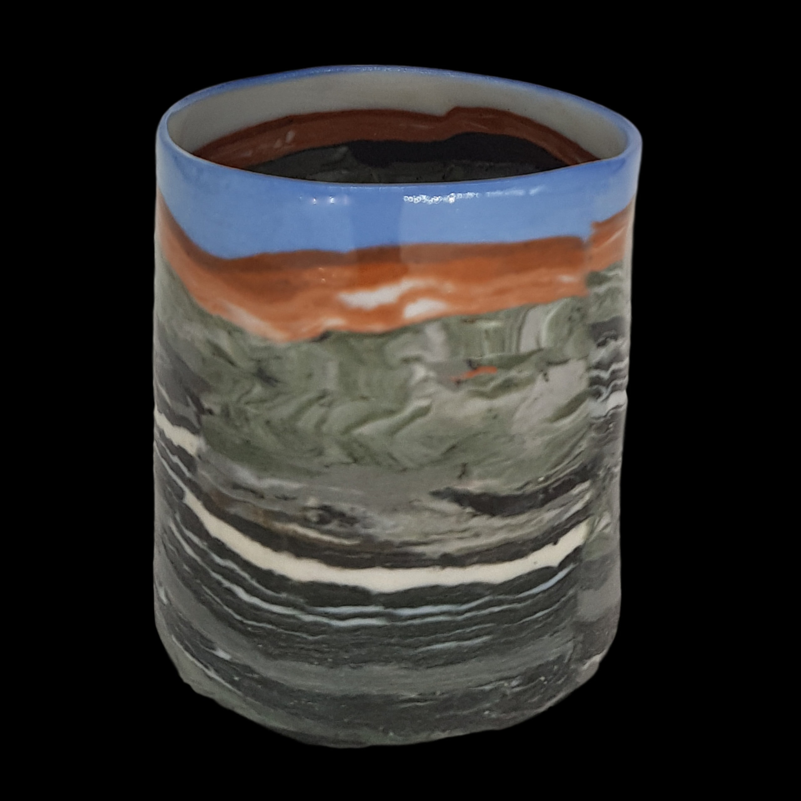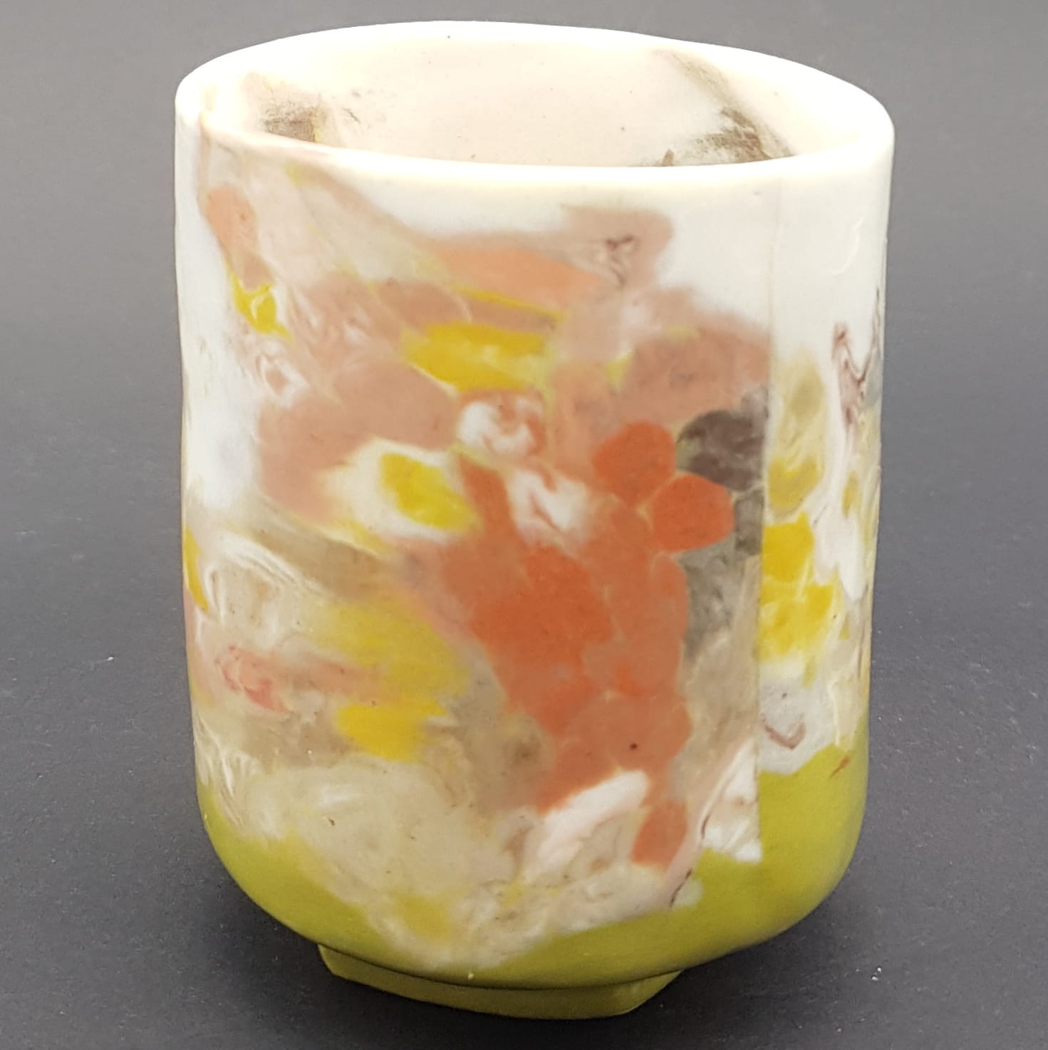 Recently I have been using nerikome or neriage techniques. I build a block or “loaf” with layers of variously coloured clays. I then cut a slice from the loaf, which reveals the pattern. The pattern goes right through the clay. This slice becomes the wall of my yunomi, and then I add the foot.
