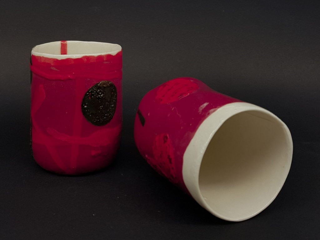 The recent ones are slab-built, from a range of dark clay, white clay or porcelain, fired to midfire cone 5 and finished with a clear glaze.